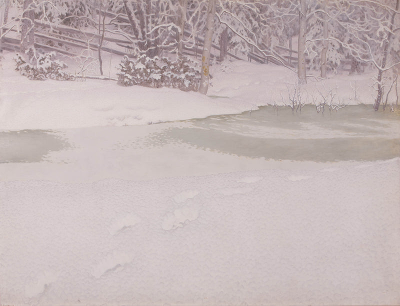 Neugefallener snow was created by the art nouveau artist Gustav Fjæstad in the year 1909. The over 110 year-old original creation was made with the size of 191 x 250 cm - frame: 200 × 258 × 8 cm. Oil on canvas was applied by the painter as the medium of the artwork. The original painting has the following inscription: signed and dated lower left: G. Fjaestad 09. Nowadays, the artwork belongs to the collection of Belvedere. We are delighted to reference that the masterpiece, which belongs to the public domain is included with courtesy of © Belvedere, Vienna, inventory number: 1120. Creditline of the artwork: purchase from Hagenbund, Vienna in 1910. The alignment is in landscape format with an aspect ratio of 4 : 3, which means that the length is 33% longer than the width. The painter Gustav Fjæstad was an artist, whose style can be classified as Art Nouveau. The artist was born in 1868 in Stockholm and died at the age of 80 in the year 1948 in Arvika, Sweden.