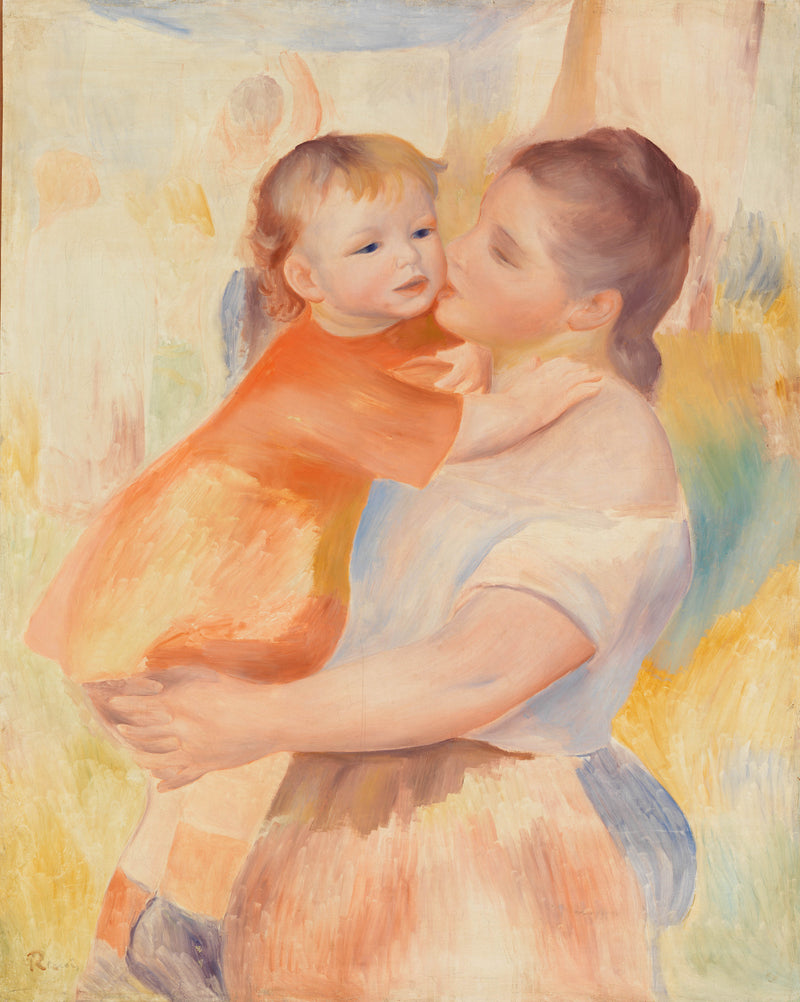 In this loving portrait Renoir depicts his wife, Aline, holding the first of their three sons. He made this work a few years after traveling to Italy to study the old masters, a trip that had an enormous impact on his career. For this work, Renoir dried out his colors—blotting as much oil as he could from the paint—to give the canvas the chalky look of an Italian fresco.