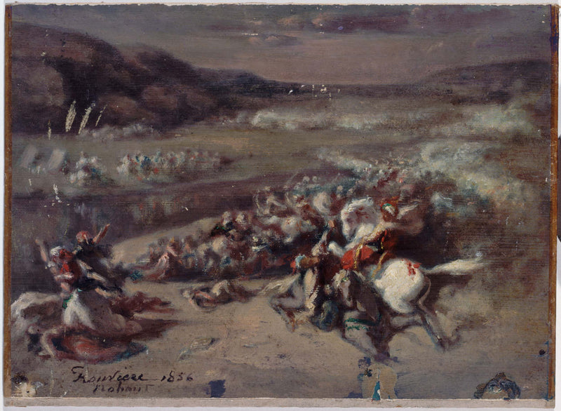 Battle Scene was made by Philibert Rouvière. The version of the artpiece was painted with the size: Height: 19,7 cm, Width: 26,7 cm. Oil painting, card paper, cardboard was applied by the painter as the medium of the painting. The original artwork is inscribed with the details: Signing of the running - Signed: "Rouviere - 1856 / Nohant". Furthermore, the artwork forms part of the digital collection of Musée de la Vie romantique Paris, which is one of the 14 City of Paris Museums that are incorporated in the public institution Paris Musées. With courtesy of - Musée de la Vie romantique Paris (public domain).Creditline of the artwork: . Furthermore, alignment is landscape and has a ratio of 4 : 3, meaning that the length is 33% longer than the width.
