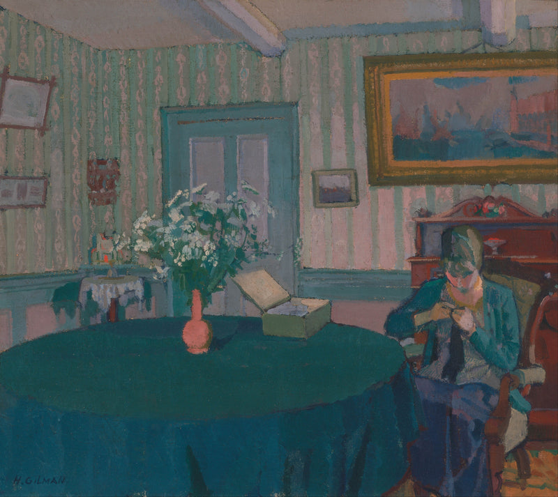 This piece of art was painted by the male British artist Harold Gilman in 1917. The original was painted with the size: Height: 413 mm (16,25 ″); Width: 464 mm (18,26 ″). Oil on canvas was applied by the European painter as the medium of the work of art. Besides, this work of art belongs to the Yale Center for British Art's art collection located in New Haven, Connecticut, United States of America. With courtesy of Yale Center for British Art & Wikimedia Commons (licensed - public domain).Creditline of the artwork: . Besides, the alignment is landscape and has a side ratio of 1.2 : 1, which implies that the length is 20% longer than the width. The painter Harold Gilman was a European artist from the United Kingdom, whose art style can be attributed mainly to Impressionism. The European artist was born in the year 1876 in Rode, Somerset, England, United Kingdom and deceased at the age of 43 in 1919.